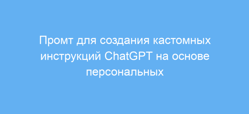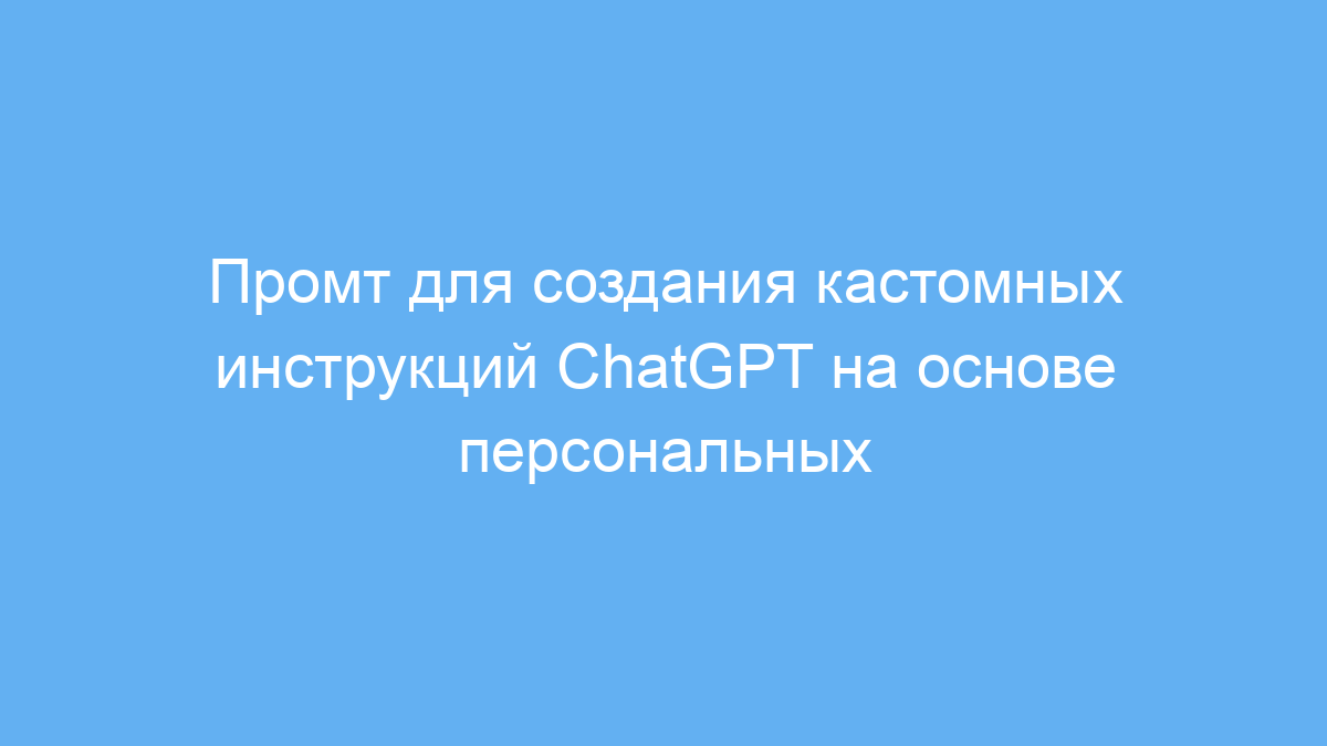 Проблема, которую решает этот промт, — отсутствие глубокой персонализации в стандартных инструкциях к ChatGPT. Часто нейросеть отвечает обобщённо, не учитывая контекст, стиль общения и индивидуальные цели пользователя. Используя этот промт, вы создаёте «кастомные» инструкции, которые помогают ChatGPT лучше понимать ваши запросы и давать ответы, максимально соответствующие вашим ожиданиям.