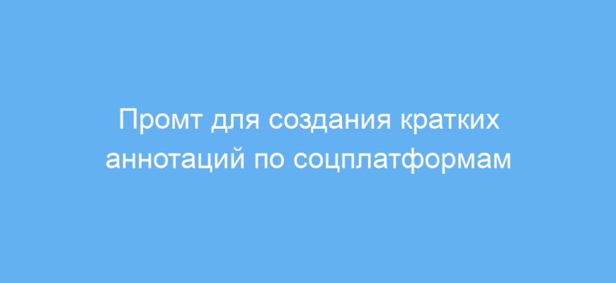 Этот промт предназначен для специалистов и пользователей, которым важно быстро сформулировать лаконичные и понятные аннотации к текстам для разных социальных платформ. Он помогает создавать описания длиной не более 280 символов, идеально подходящие для Twitter, Instagram и других соцсетей, где ценится краткость и ясность.