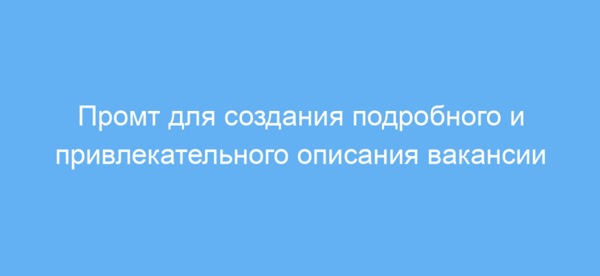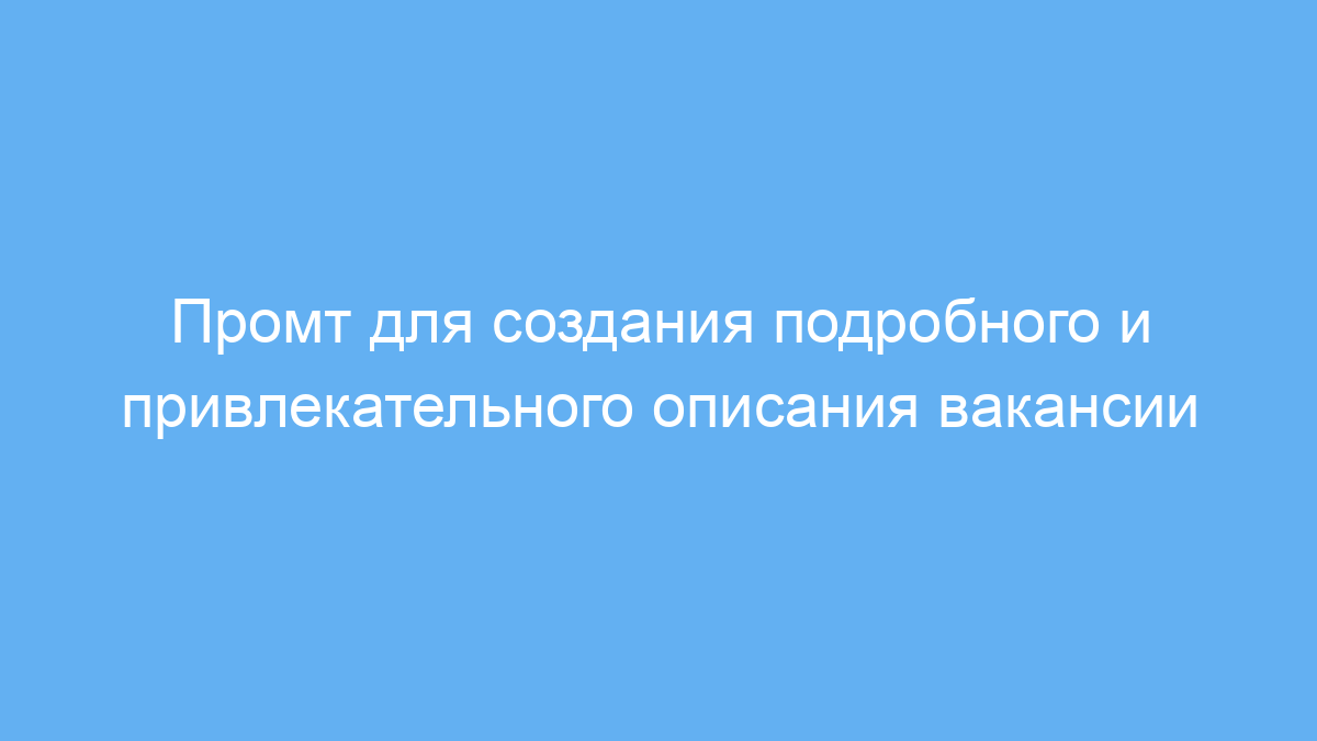 Этот промт позволяет быстро и эффективно создавать структурированные, понятные и привлекательные описания вакансий. Он сокращает время подготовки текста и помогает привлечь именно тех кандидатов, которые подходят вашей компании по требованиям и ожиданиям. Использование промта снижает риск ошибок и неоднозначностей в объявлении и улучшает коммуникацию с соискателями.