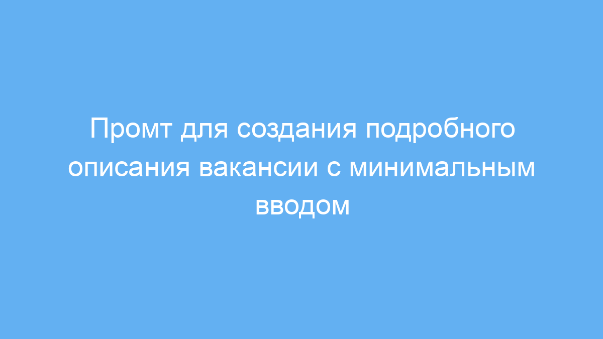 Промт помогает решить эту проблему, запрашивая у пользователя только базовую информацию — название должности, компанию и место работы. Далее нейросеть автоматически дополняет описание, используя стандартные требования, обязанности и детали, если они ей известны. Так можно получить полноценный текст, который уже содержит информацию о зарплате, формате работы, возможностях карьерного роста и корпоративной культуре. Такой подход экономит время и повышает конверсию объявлений о работе.