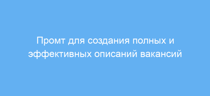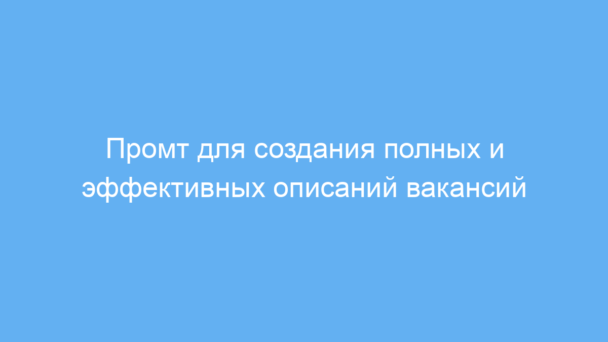 Этот промт предназначен для HR-специалистов, рекрутеров и менеджеров по персоналу, которые хотят быстро и качественно создавать описания вакансий. Использование данного промта значительно упрощает процесс составления подробных, индивидуализированных и привлекательных объявлений о работе.