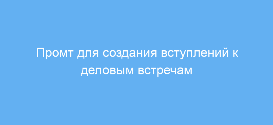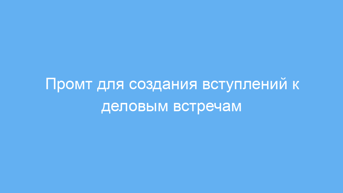 Этот промт разработан для специалистов, которые регулярно проводят деловые встречи и хотят быстро и легко подготовить профессиональные вступления. Он поможет сэкономить время, избежать неловких пауз и сделать начало встречи уверенным и структурированным.