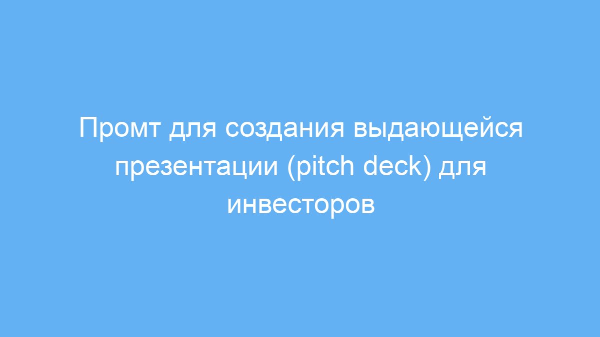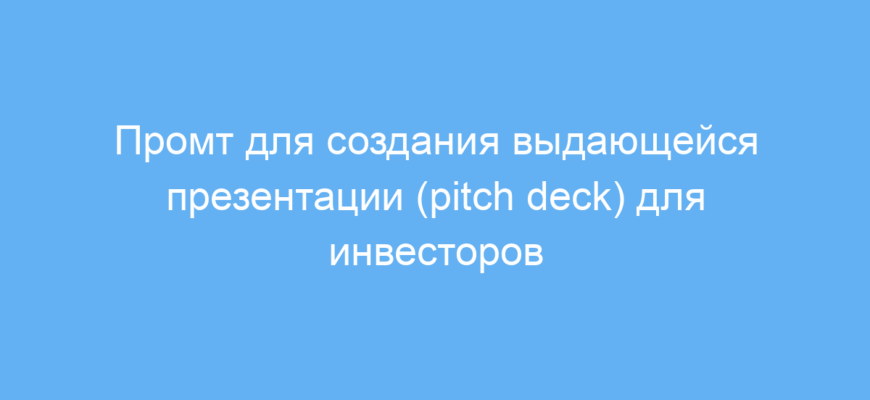Этот промт предназначен для предпринимателей, стартаперов, маркетологов и консультантов, которым необходимо быстро и качественно подготовить презентацию для инвесторов или партнеров. Он помогает структурировать информацию о компании, выделить ключевые моменты и сделать презентацию понятной, увлекательной и привлекательной.