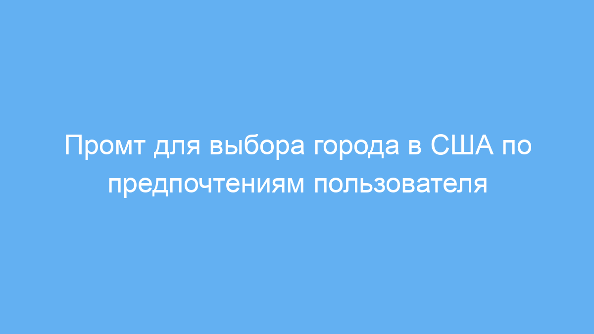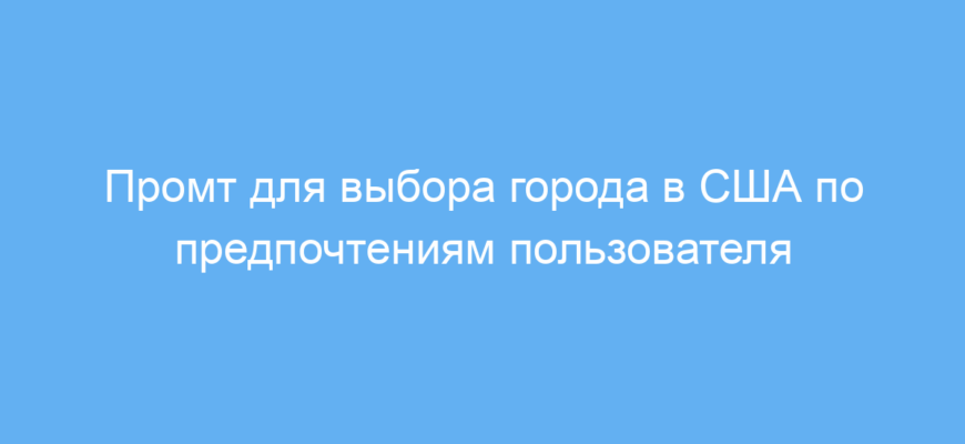 Этот промт предназначен для людей, которые хотят подобрать подходящий для жизни город в США, учитывая свои личные предпочтения. Он полезен тем, кто планирует сменить место жительства, переехать по работе или просто интересуется обстановкой в разных американских городах и хочет сделать выбор осознанно.