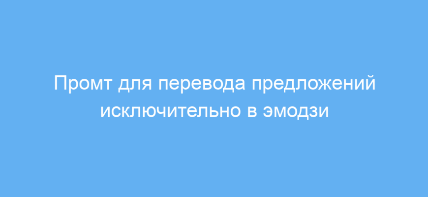 Этот промт предназначен для тех, кто хочет быстро и просто преобразовывать текстовые предложения в эмодзи. Он полезен для создания красочных и креативных сообщений, которые легко воспринимаются, например, в соцсетях, мессенджерах или для оформления контента. Благодаря промту можно визуально выразить идеи или вопросы без использования обычного текста, что помогает привлечь внимание и разнообразить коммуникацию.