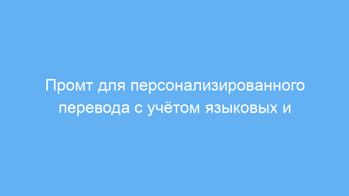 Этот промт предназначен для тех, кто хочет получить качественный перевод текста, учитывающий не только прямой смысл, но и языковые навыки, культурные особенности и стиль общения. Он помогает компаниям, переводчикам, студентам и всем, кто сталкивается с необходимостью адаптировать тексты под разные языки и аудитории.