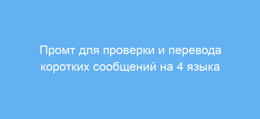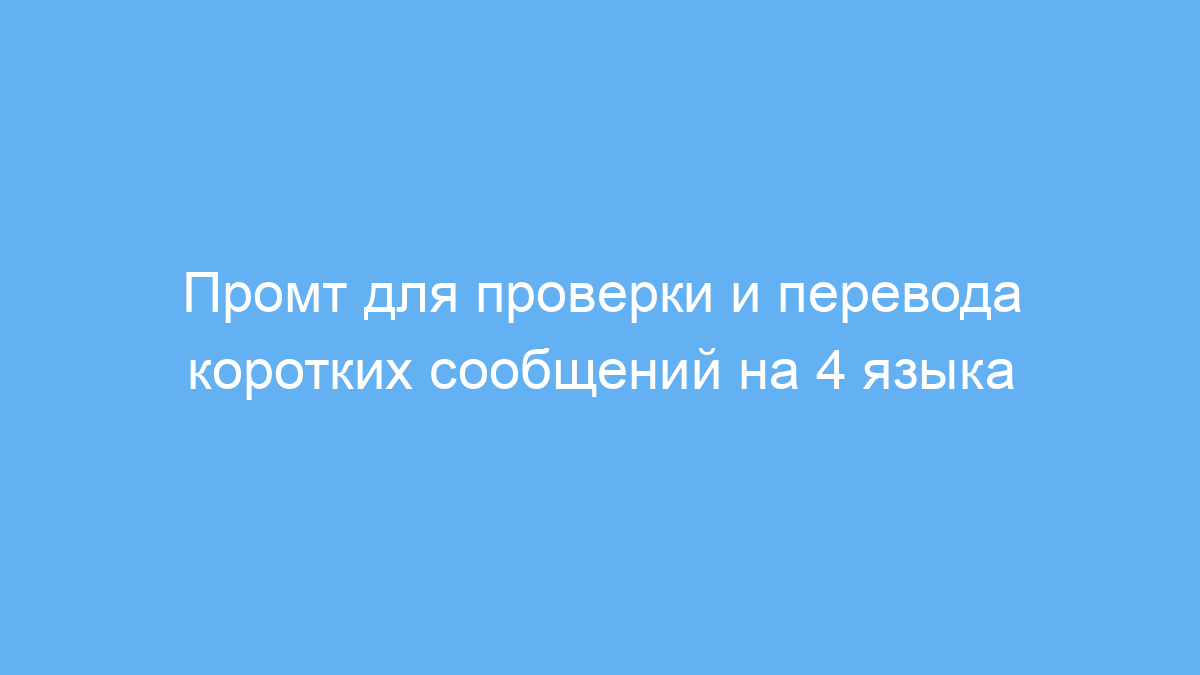 Этот промт экономит ваше время, автоматически выявляя и исправляя ошибки в коротких сообщениях, а также позволяя быстро получить корректные переводы на четыре языка. Он помогает сохранить стиль, структуру и смысл текста, что особенно важно при работе с контентом для разных стран и аудиторий.