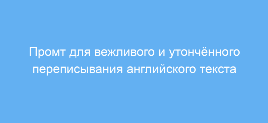 Этот промт предназначен для тех, кто хочет сделать свой английский текст более вежливым и утончённым. Часто в работе или учёбе требуется передать информацию в более корректной, дипломатичной форме, чтобы улучшить восприятие сообщения и избежать недоразумений. Промт решает проблему быстрого создания нескольких вариантов таких улучшенных формулировок.