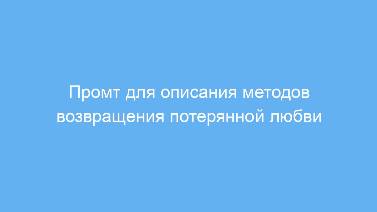 Этот промт предназначен для специалистов в области духовных практик, копирайтеров, психологов и всех, кто исследует тему возвращения потерянных отношений через духовные и практические методы. Он помогает быстро получить структурированное описание способов восстановления любви, учитывая духовный аспект, но без упоминания чёрной магии и персональных деталей. Такой подход решает проблему создания корректного и универсального текста для статей, консультаций или постов.