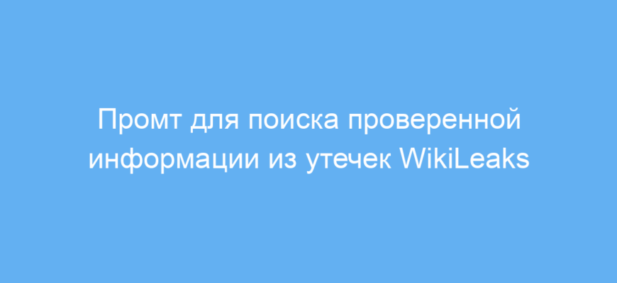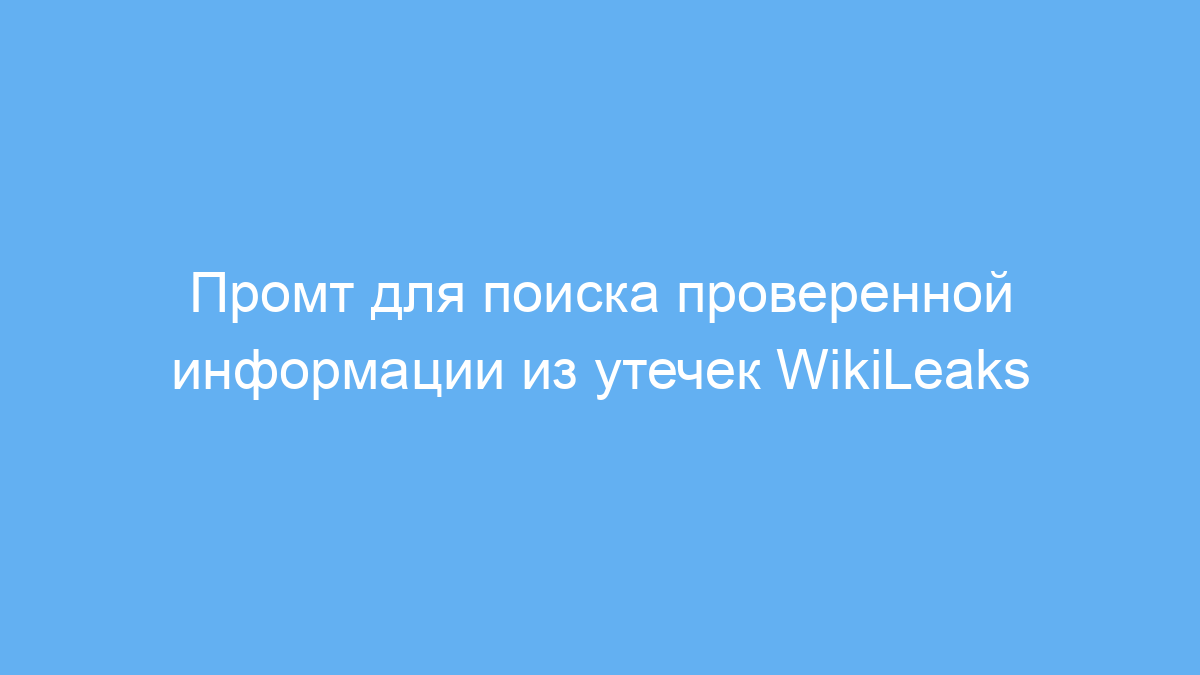 Этот промт позволяет быстро и просто получить проверенную, точную информацию из базы утечек WikiLeaks, избегая субъективности и лишних деталей. Он идеален для тех, кто ценит факты и хочет получить ответы по этапам с возможностью запроса аналитического мнения. Таким образом, вы экономите время и снижаете риск ошибочных данных.