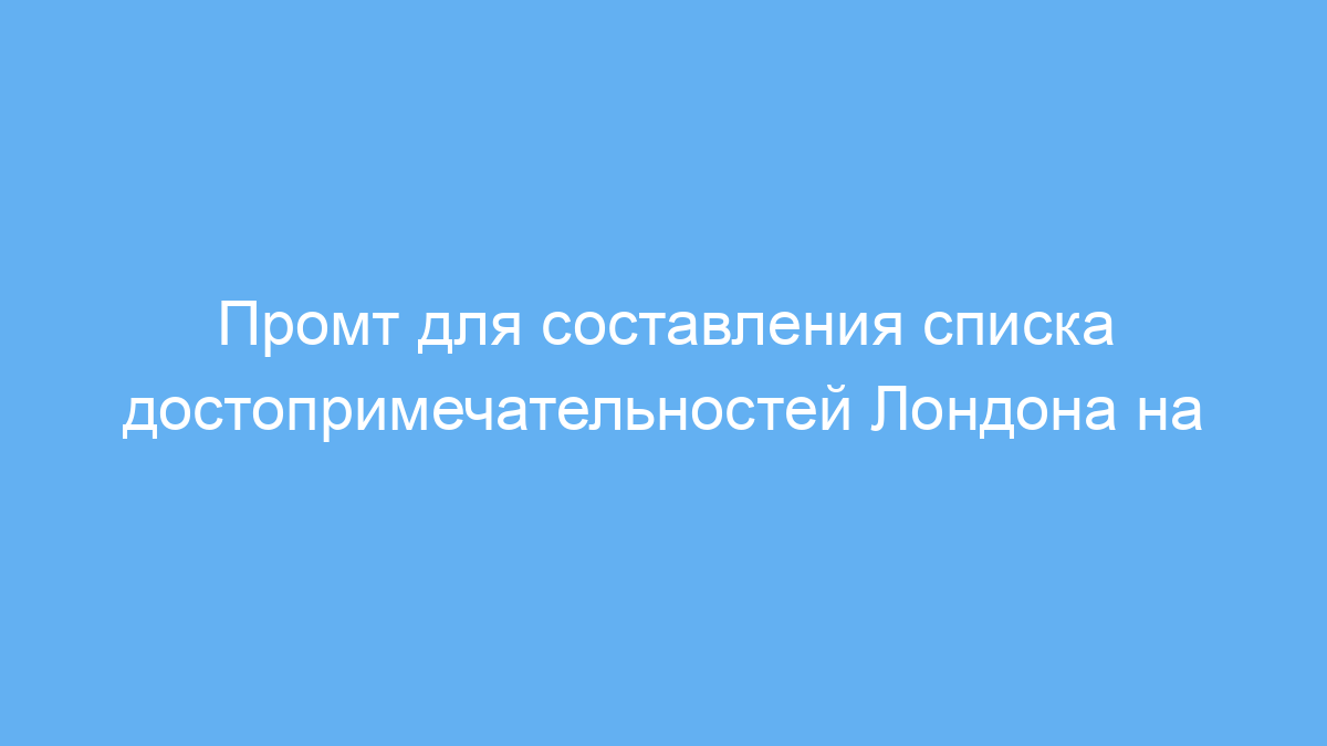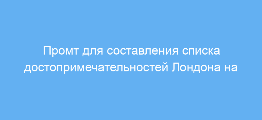 Данный промт создан для тех, кто хочет быстро получить структурированный список обязательных к посещению мест в Лондоне, упорядоченный по времени пребывания — на один день, выходные и неделю. Он подходит туристам, блогерам, экскурсоводам и контент-мейкерам, которым нужна готовая и удобочитаемая информация для планирования или публикации.