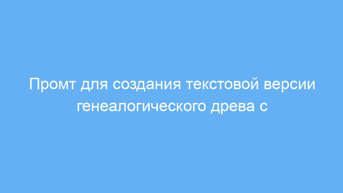 Данный промт предназначен для тех, кто хочет быстро и удобно составить текстовую версию генеалогического древа — начиная с бабушек и дедушек и доходя до правнуков. Это может быть полезно как родословным исследователям, так и людям, планирующим сбор семейных историй или создание визуальных схем родственных связей. Использование промта упрощает структурирование информации, помогает не упустить важные детали и формирует читаемый и наглядный майндмэп в формате markdown.