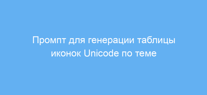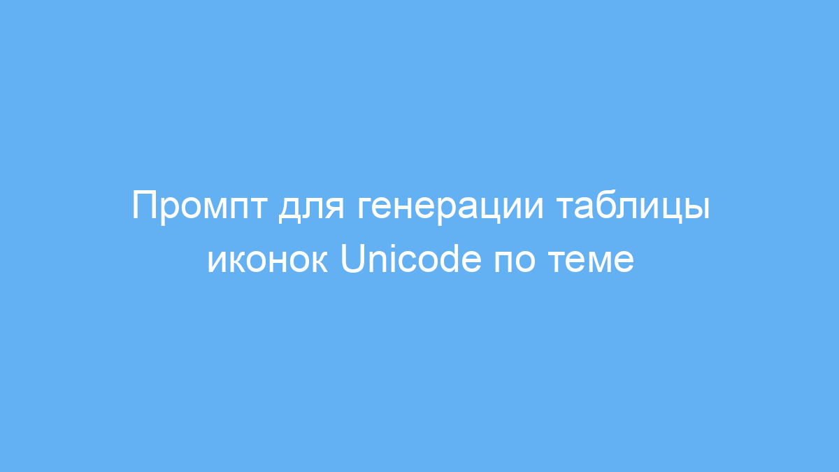 Данный промпт значительно упрощает процесс подбора и систематизации Unicode-иконок по выбранной теме. Он автоматизирует создание удобной таблицы с визуализацией, именами и кодами символов, что экономит время, облегчает подготовку контента и гарантирует точность данных.