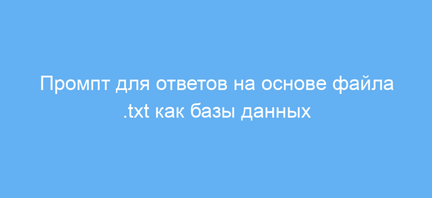 Этот промпт предназначен для пользователей, которые хотят получать точные ответы на вопросы, опираясь на информацию из конкретного текстового файла формата .txt. Он полезен людям, работающим с большими объемами текстовых данных или документацией в формате .txt, когда нужно искать и обрабатывать информацию как из базы данных.