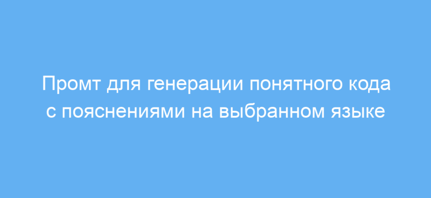 Главная задача промта — сначала уточнить, на каком языке должен быть написан код, а затем создать понятный и хорошо организованный пример с подробным объяснением каждого шага. Такой подход помогает пользователям лучше понять работу кода и ускоряет процесс обучения или разработки.