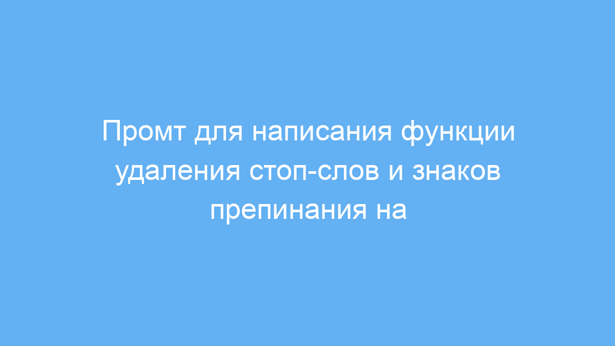 Этот промт предназначен для программистов, аналитиков и специалистов по обработке текста, которые хотят быстро создать функцию на Python для очистки текстовых данных. Он помогает автоматизировать удаление стоп-слов на английском языке и знаков препинания, что важно для подготовки текстов к анализу или машинному обучению.