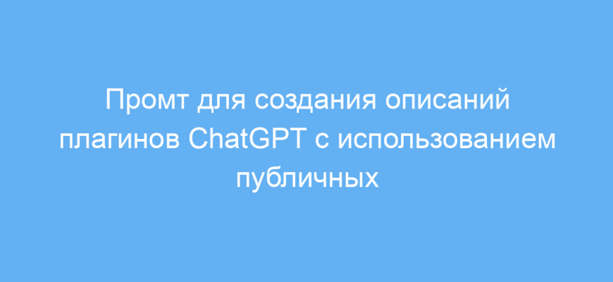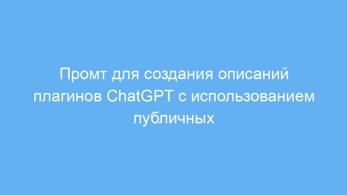 Используйте этот промт для генерации идей и описаний плагинов как отправную точку при планировании расширений для ChatGPT. Рекомендуется внимательно проверить данные API, чтобы убедиться, что они действительно публичные и не нарушают правила конфиденциальности.