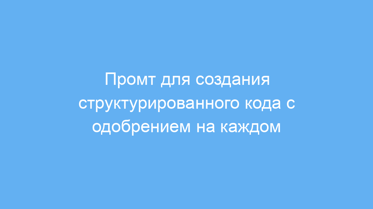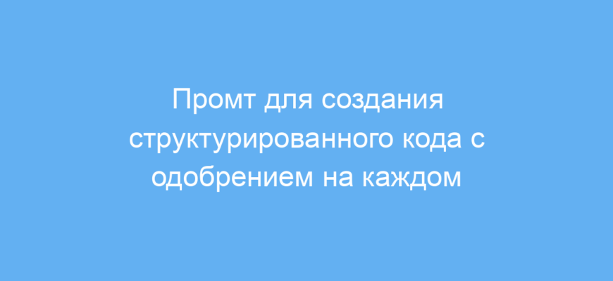 Проблема, которую решает данный промт, заключается в том, что при автоматизированной генерации программного кода сложно сразу получить полностью точный и структурированный результат. Начинающий или даже опытный разработчик может столкнуться с ошибками, неполнотой или несоответствием требований. Этот промт заставляет нейросеть предварительно согласовывать любой фрагмент — компонент, файл, функцию или раздел — прежде чем писать полный код. Это позволяет своевременно вносить правки и уточнения, а также задавать вопросы для улучшения качества конечного продукта.