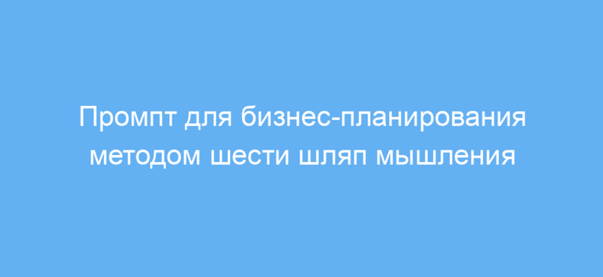 Этот промпт создан для тех, кто собирается начать малый бизнес и хочет структурировать процесс планирования. Он помогает взглянуть на бизнес-идею с разных сторон: факты, эмоции, риски, возможности, креатив и организация. Такой подход называется «метод шести шляп мышления» Эдварда де Боно.