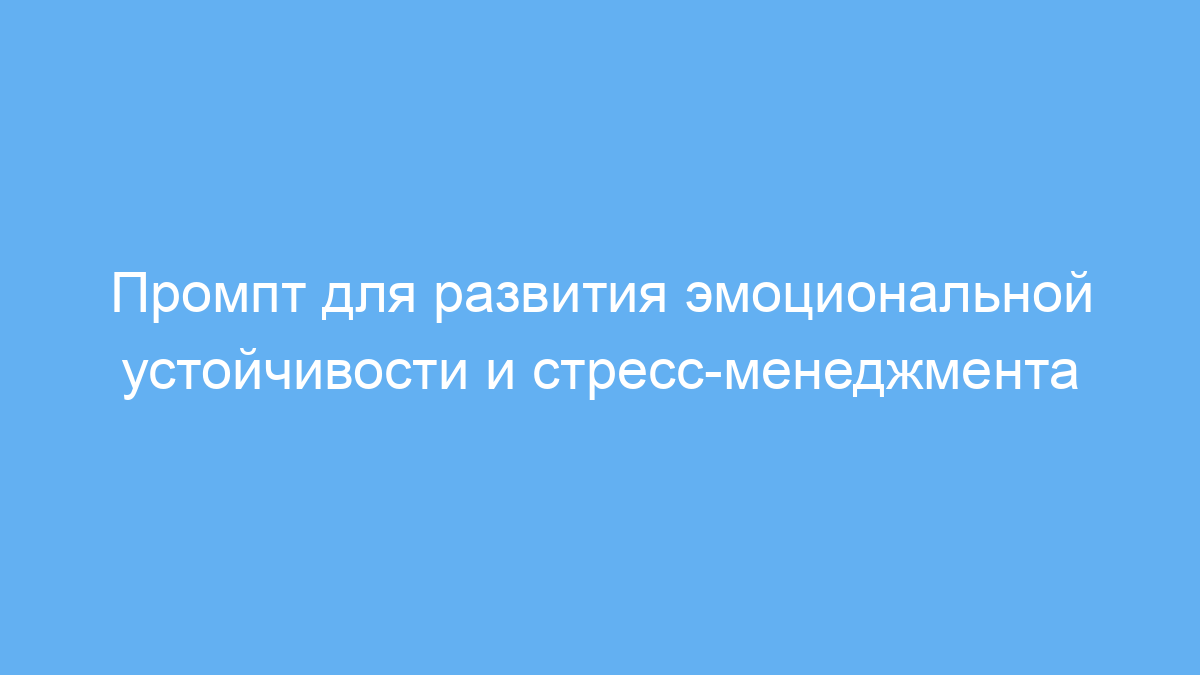 Этот промпт предназначен для тех, кто хочет развить эмоциональную устойчивость и научиться справляться со стрессовыми ситуациями. Он будет полезен психологам, тренерам, педагогам, а также всем, кто заинтересован в личностном росте и улучшении своего эмоционального состояния.