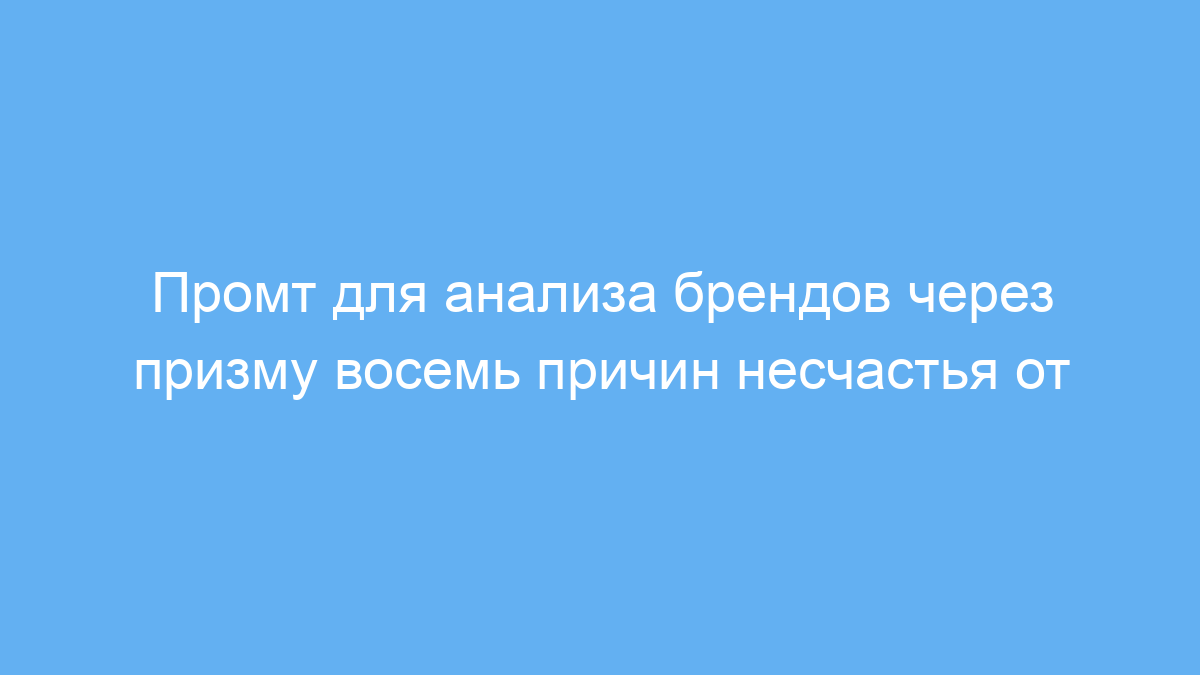 Данный промт предназначен для маркетологов, копирайтеров, социальных аналитиков и всех, кто хочет глубже понять, как определённый бренд или продукт взаимодействует с восприятием и эмоциями людей. Он помогает выявить двойственное влияние бренда на человеческое состояние, опираясь на философские идеи Бертрана Рассела о восьми причинах несчастья.