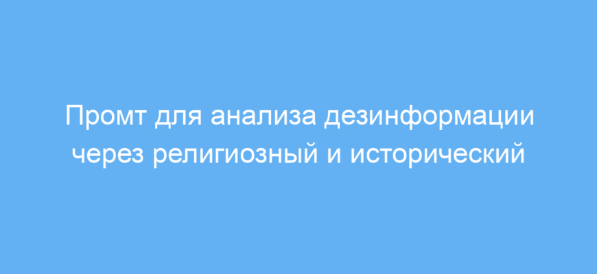 Этот промт помогает получить нестандартный и глубокий анализ сложной темы дезинформации с историко-религиозным подходом. Он экономит время на формулировку правильных вопросов, структурируя ответ по важным факторам и побуждая к дальнейшему диалогу. Такой подход облегчает понимание и обсуждение сложных культурных и информационных феноменов.