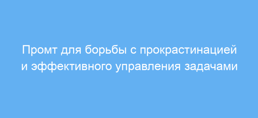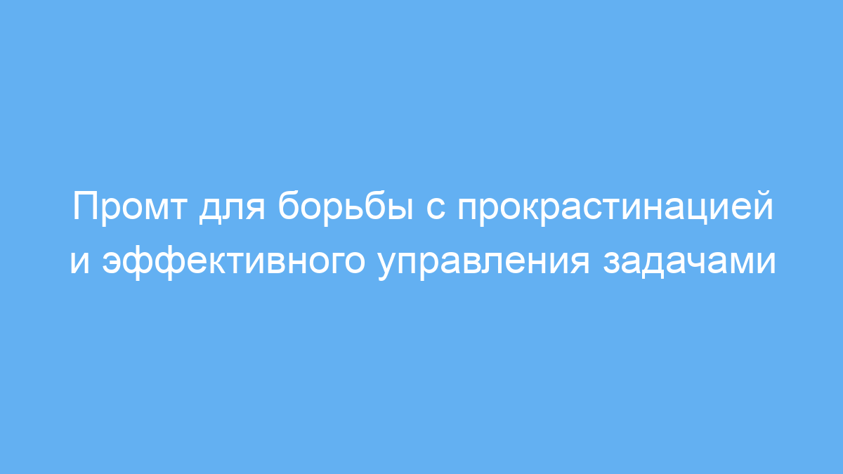 Этот промт предназначен для тех, кто сталкивается с прокрастинацией и хочет научиться управлять своими задачами более эффективно. Прокрастинация — распространённая проблема, которая мешает начать дела, откладывает важные задачи и снижает продуктивность как в работе, так и в учёбе.