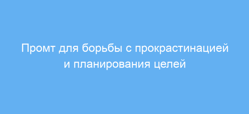 Этот промт создан для тех, кто сталкивается с прокрастинацией и хочет повысить свою продуктивность. Он помогает упорядочить мысли, сформировать чёткий план действий и сфокусироваться на достижении конкретных целей. Особенно полезен студентам, специалистам, фрилансерам и всем, кто хочет перестать откладывать важные дела.