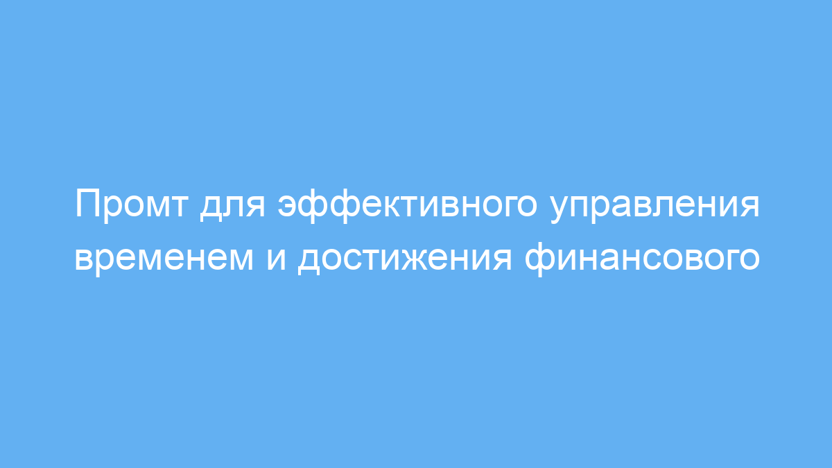 Этот промт предназначен для тех, кто строит своё финансовое благополучие и стремится повысить продуктивность через лучшее управление временем. Если у вас несколько проектов, основная работа, дополнительный бизнес и задачи по личным финансам, этот промт поможет найти оптимальные стратегии и методы организации рабочего дня.
