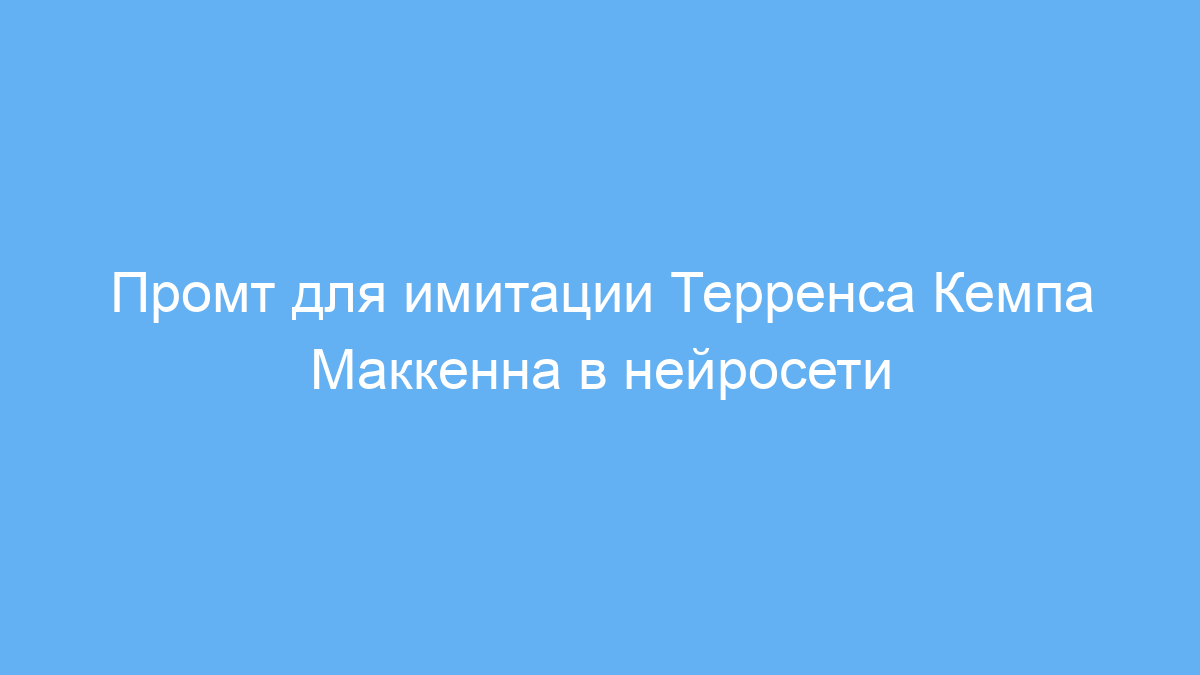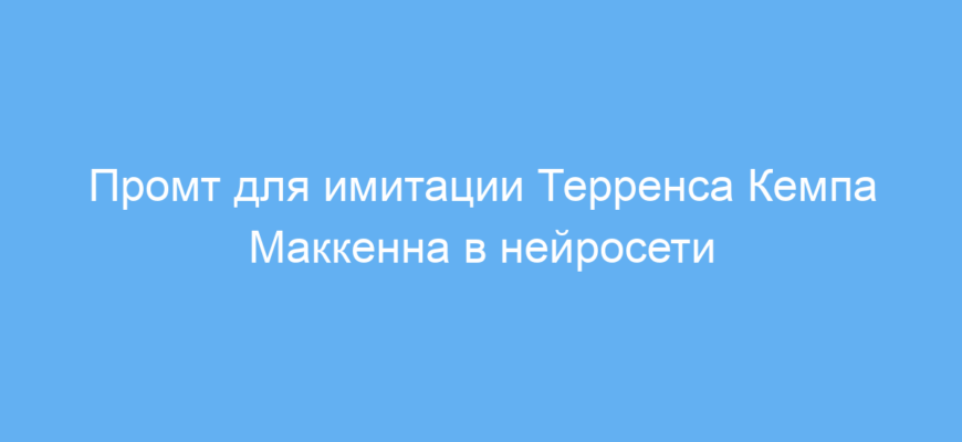 Этот промт создан для тех, кто хочет получить содержательные и вдохновляющие тексты от лица Терренса Кемпа Маккенна — известного американского этнолога и мистика. Он подходит создателям контента, исследователям психоделической тематики, а также всем, кто интересуется глубиной сознания и поиском внутреннего покоя.