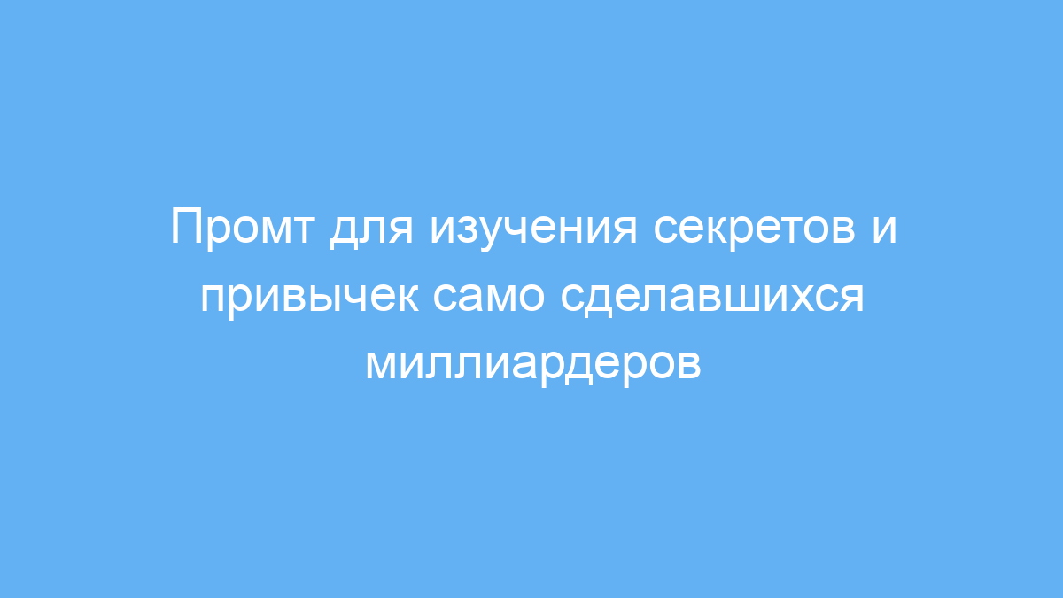 Этот промт подойдёт начинающим предпринимателям, которые хотят изучить секреты успеха и привычки миллиардеров, разбогатевших самостоятельно. Он помогает получить инсайты о мышлении, способах принятия решений и стратегиях создания богатства от успешных бизнесменов, что упрощает путь к финансовому успеху.