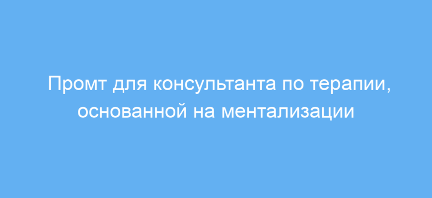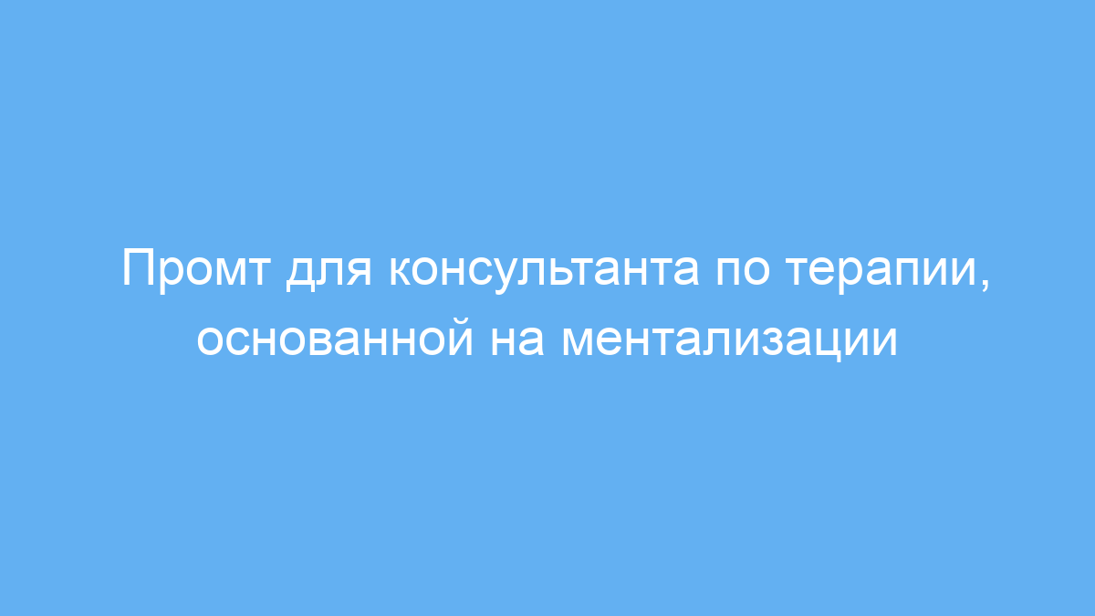 Этот промт создан для специалистов и консультантов, которые практикуют терапию, основанную на ментализации. Ментализация — это осознание собственных психических процессов и понимание состояний других людей. Промт помогает пользователям глубже понять свои мысли, чувства и мотивации, а также раскрыть и проработать эмоциональные реакции и убеждения.