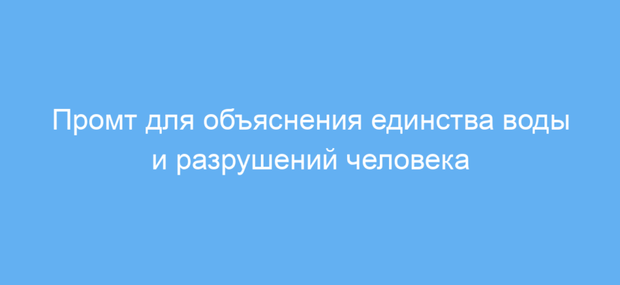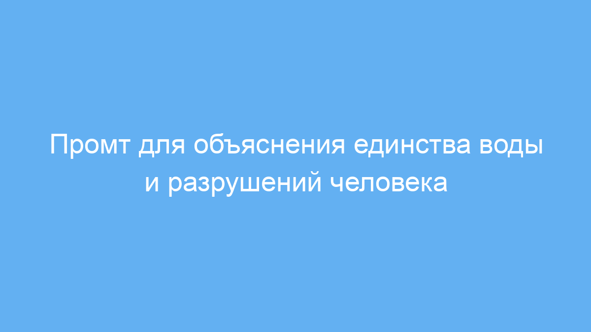 Этот промт предназначен для тех, кто хочет создавать тексты или комментарии о воде и её использовании с глубоким смыслом и экологическим посылом. Он помогает показывать, что вода на планете — это единое целое, и что все привычные человеку деления воды на разные объекты или функции являются лишь искусственными концепциями.