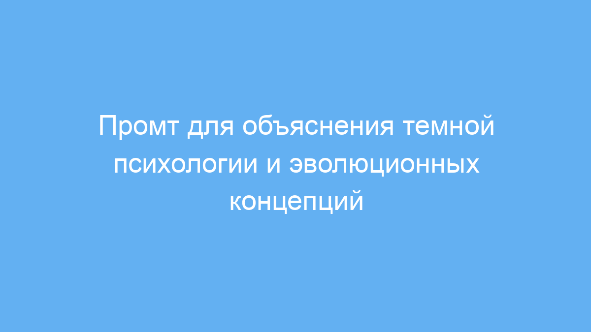 Этот промт создан для пользователей нейросетей, которые хотят изучить и понять сложные темы, связанные с эволюционной психологией и темными аспектами человеческой природы. Он отлично пригодится психологам, исследователям, студентам и всем, кто интересуется социальными и биологическими теориями, такими как социал-дарвинизм, евгеника, биологический детерминизм и темная триада.