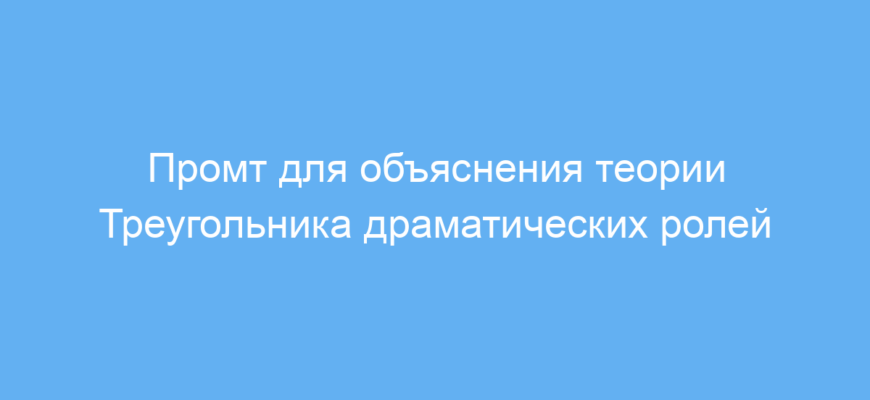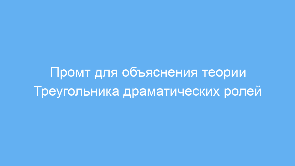 Этот промт предназначен для психологов, коучей, педагогов и всех, кто интересуется межличностной динамикой и хочет лучше понимать модели поведения в общении. Он помогает разъяснить теорию Треугольника драматических ролей Карпмана, описывающую три распространённые социальные роли: Жертва, Спасатель и Преследователь.