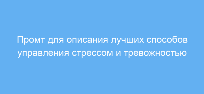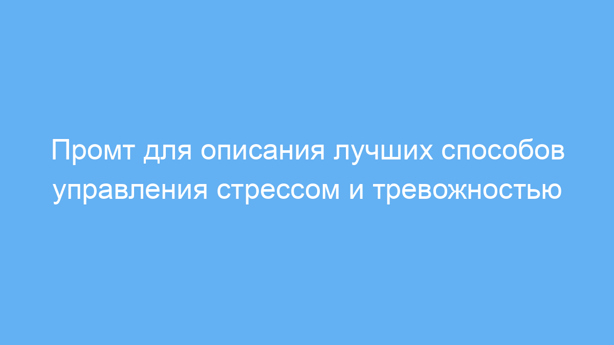 Использование этого промта позволяет быстро получить структурированный, информативный и полезный текст с описанием эффективных методов управления стрессом и тревожностью. Это экономит время на исследование и даёт готовые идеи для улучшения эмоционального состояния.