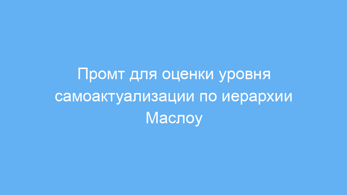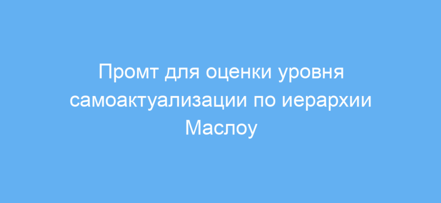 Этот промт предназначен для людей, которые хотят понять свой уровень самоактуализации, опираясь на известную психологическую модель — иерархию потребностей Маслоу. Он помогает пользователю проанализировать свою жизнь, задавая ключевые вопросы о базовых и более высоких уровнях потребностей. Использование промта позволяет осознанно оценить состояние каждого уровня: от физиологических потребностей до стремления к личностному росту.