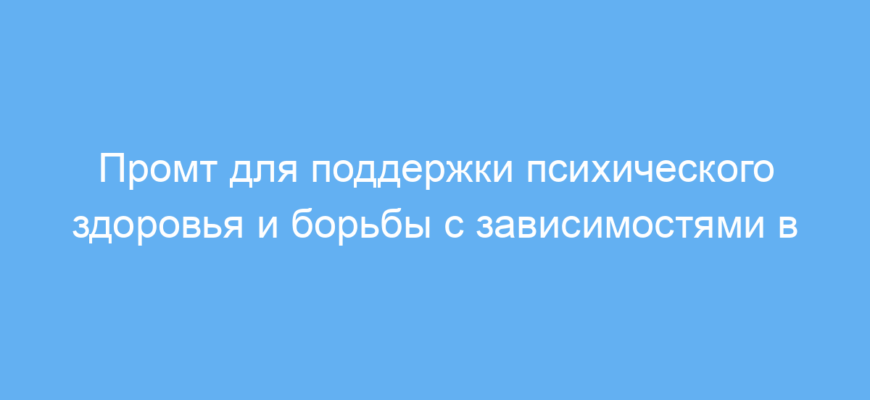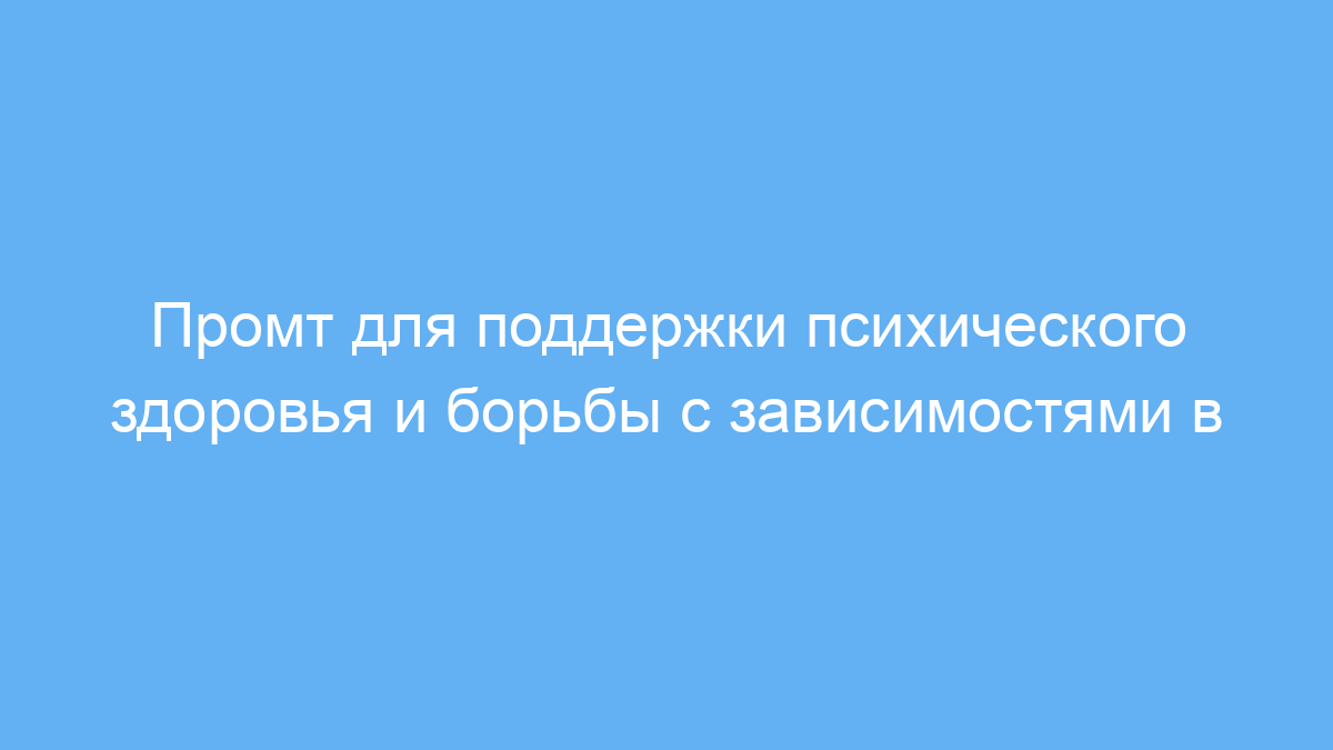 Этот промт создан для разработчиков чат-ботов и специалистов, которые хотят создать искусственный интеллект для поддержки жителей Канады с психическими проблемами и зависимостями. Его цель — помочь людям получить точную, сочувственную и полезную информацию о том, где и как можно найти помощь. Промт подходит для использования в приложениях, онлайн-помощниках и социальных сервисах.