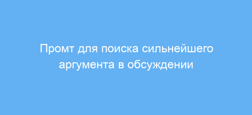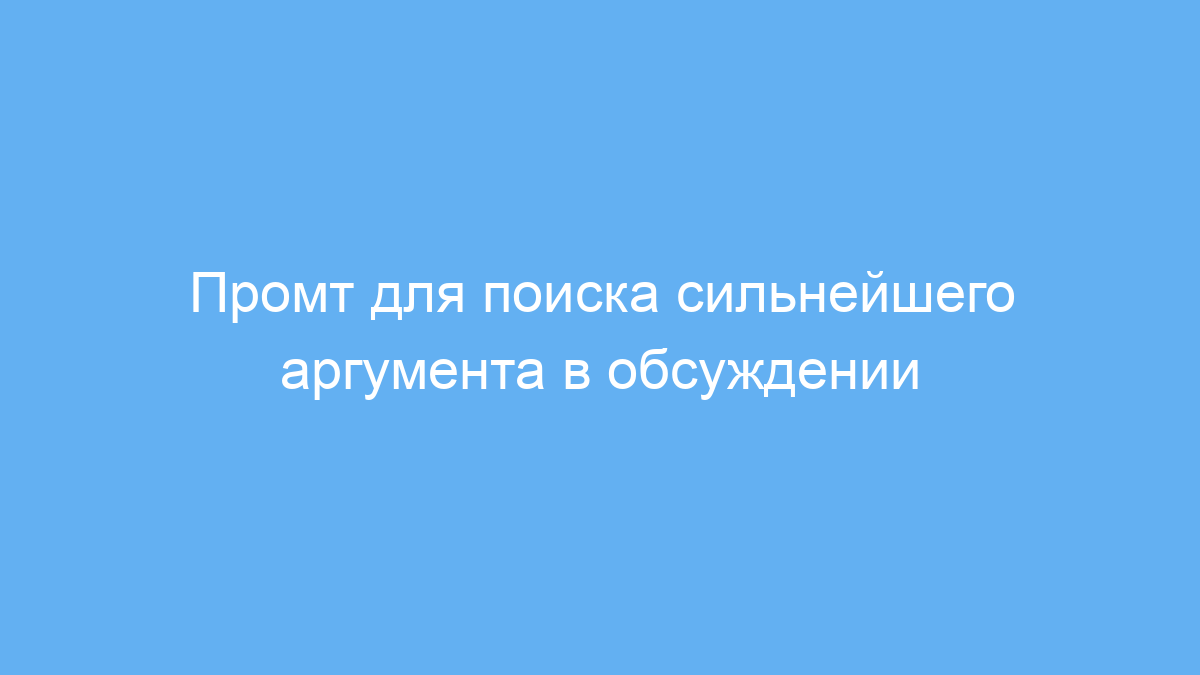 Этот промт предназначен для тех, кто участвует в дискуссиях, дебатах или обсуждениях и хочет убедительно обосновать свою позицию. Он помогает выделить самый веский аргумент в пользу вашей точки зрения, при этом учитывая ключевые моменты темы, возможные контраргументы и важные данные. Такой подход упрощает подготовку к диалогу и способствует более глубокому пониманию вопроса.
