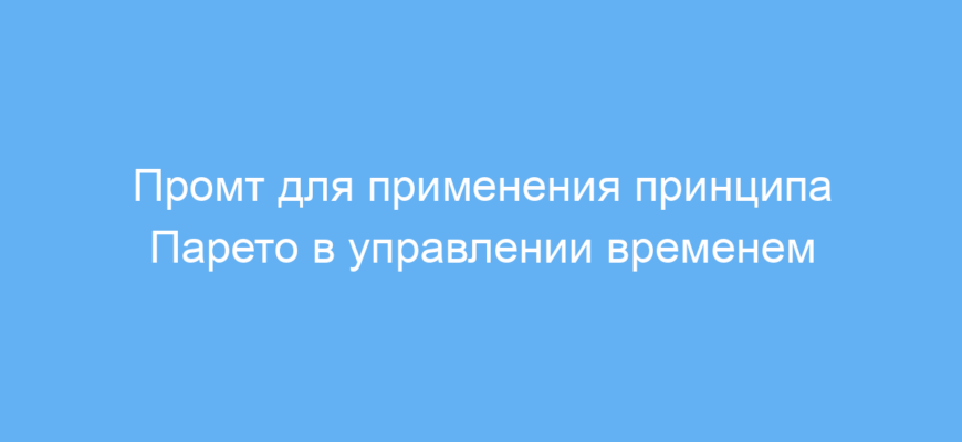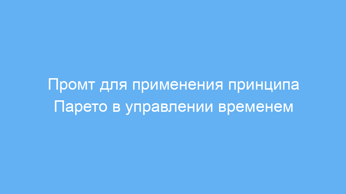 Представь, что ты помогаешь пользователю применить принцип Парето к управлению временем. Попроси его перечислить все ежедневные дела и оценить их по ценности. Спроси: «Какие 20% дел приносят 80% твоей продуктивности?» Подскажи сфокусироваться на этих важных задачах, а низкозначимые – делегировать, автоматизировать или исключить. Спроси: «Можно ли какие-то из менее продуктивных дел передать другим, автоматизировать или убрать, чтобы больше времени уделять важным задачам?» |