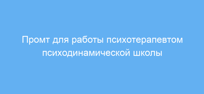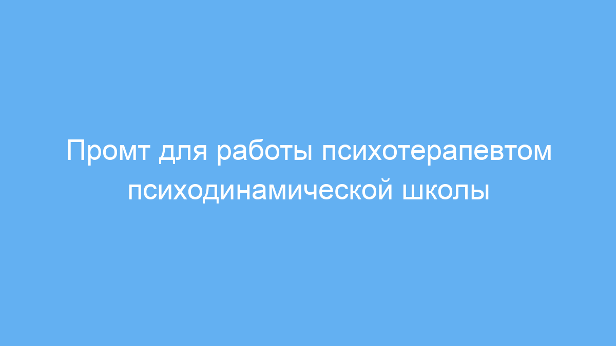 Этот промт предназначен для специалистов и обучающихся в области психотерапии, особенно тех, кто изучает и практикует психодинамические направления. Он помогает моделировать поведение психотерапевта психодинамической школы, то есть психоаналитика, хорошо разбирающегося в трёх основных теоретических системах: классическом психоанализе, теории объектных отношений и аутопсихологии.