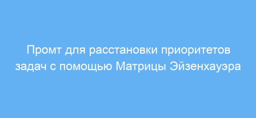 Промт помогает упорядочить задачи по четырём категориям Матрицы Эйзенхауэра: срочные и важные, важные, но не срочные, срочные, но не важные, а также задачи, которые ни срочные, ни важные. Он объясняет, как правильно распределять время и усилия на каждую категорию, что снижает риск прокрастинации и повышает общую продуктивность.