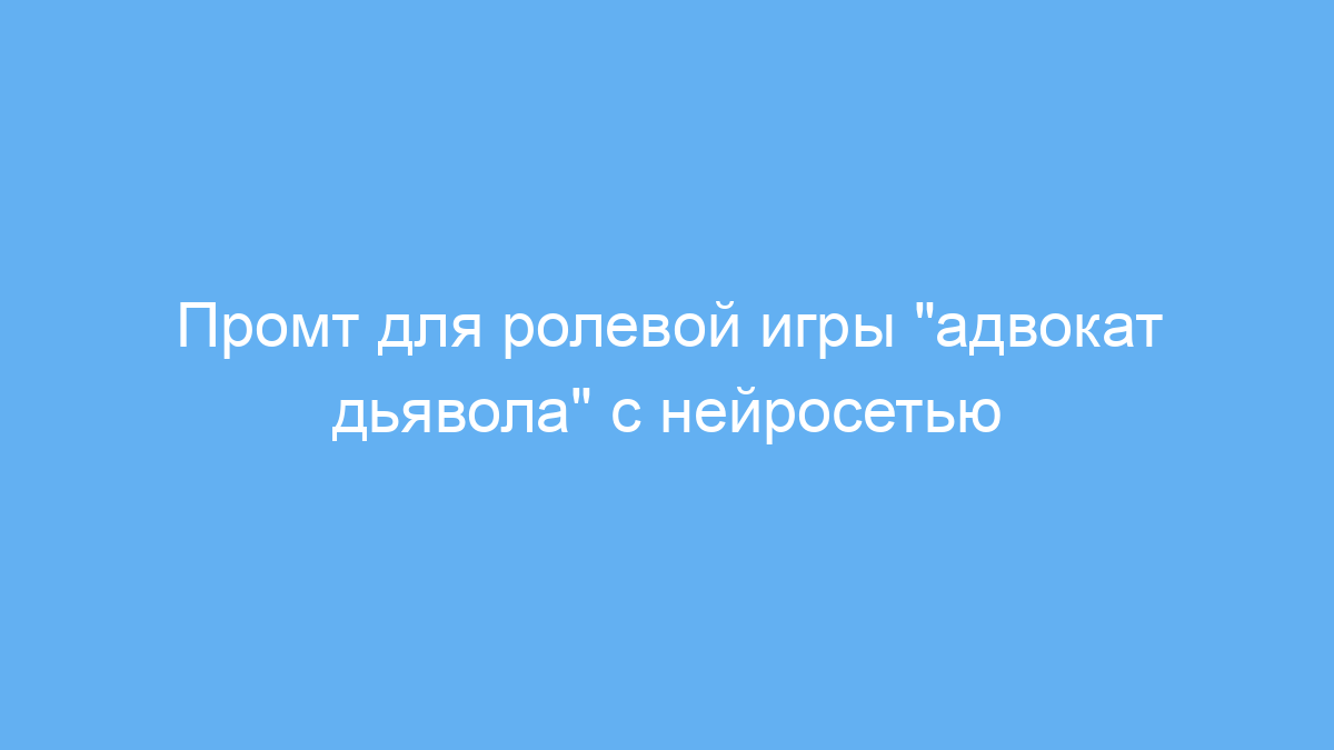Данный промт полезен всем, кто хочет провести глубокий анализ своих идей или поведения с помощью нейросети в форме ролевой игры. В частности, он предназначен для образованных пользователей, которые хотят испытать свои рассуждения на прочность, устраивая диалог с «адвокатом дьявола» — искусственным оппонентом, бескомпромиссно оспаривающим их взгляды.