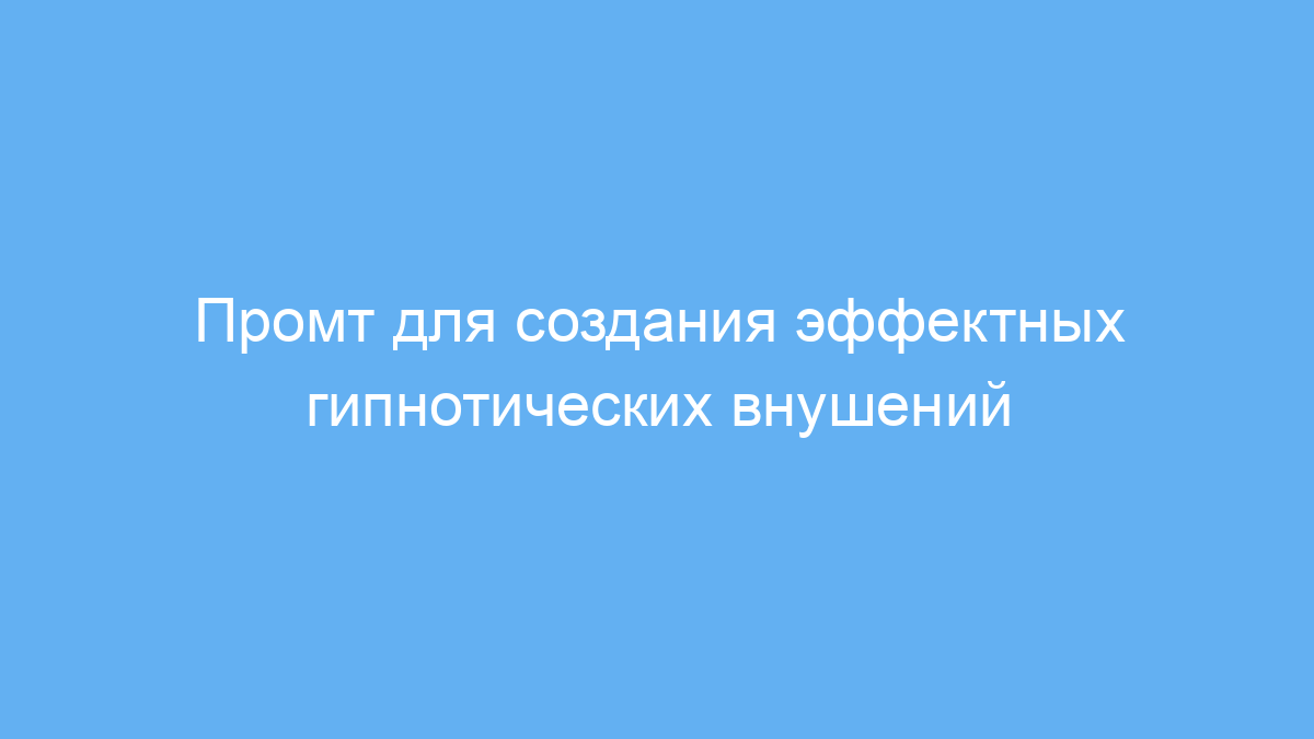 Данный промт предназначен для пользователей, которые хотят создавать убедительные и стилизованные гипнотические внушения с помощью нейросетей. Он полезен копирайтерам, сценаристам, психологам и всем, кто заинтересован в создании текстов с сильным эмоциональным и внушающим эффектом. Основная задача промта — помочь генератору текста принимать роль опытного гипнотизёра, создавая короткие, запоминающиеся фразы, которые воспринимаются как своеобразные заклинания.