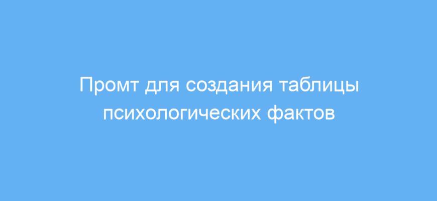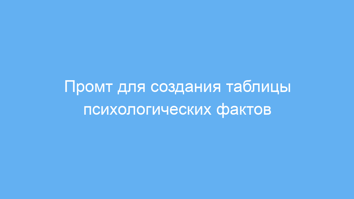 Этот промт предназначен для специалистов, блогеров и контент-менеджеров, которые хотят быстро получить структурированную подборку психологических фактов. Его основная задача — создать список фактов в форме удобной таблицы с тремя столбцами: заголовок, первая часть и вторая часть. Такая таблица отлично подходит для публикаций, презентаций или образовательных материалов.