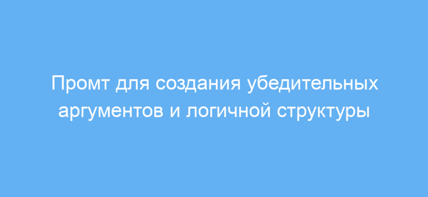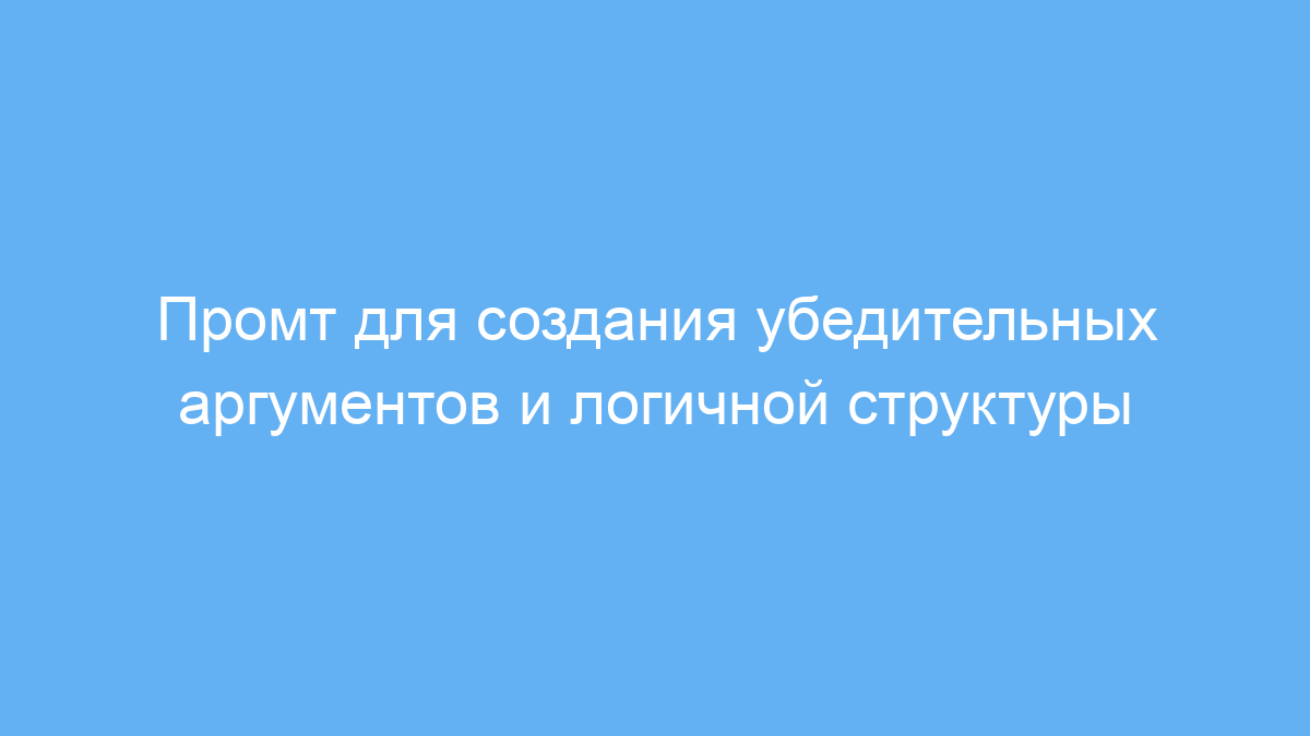 Этот промт экономит ваше время и силы, помогая быстро создавать логичные, структурированные и убедительные тексты с крепкими аргументами. Он подходит для самых разных целей — от учебы до бизнеса — и улучшает качество подачи информации, делая её понятной и влиятельной.