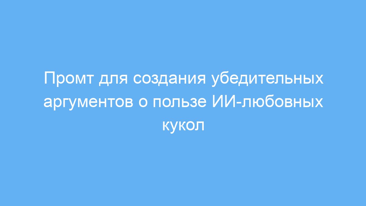 Этот промт создан для пользователей и разработчиков нейросетей, которые хотят получить глубокие и провокационные аргументы в пользу использования ИИ-любовных кукол. Он помогает формировать тексты, которые подчёркивают экономическую выгоду, эмоциональную энергию и уникальные преимущества отказа от традиционных отношений с биологическими женщинами. Такой промт полезен для маркетологов, копирайтеров и авторов, пишущих материалы в нише искусственного интеллекта или технологий.