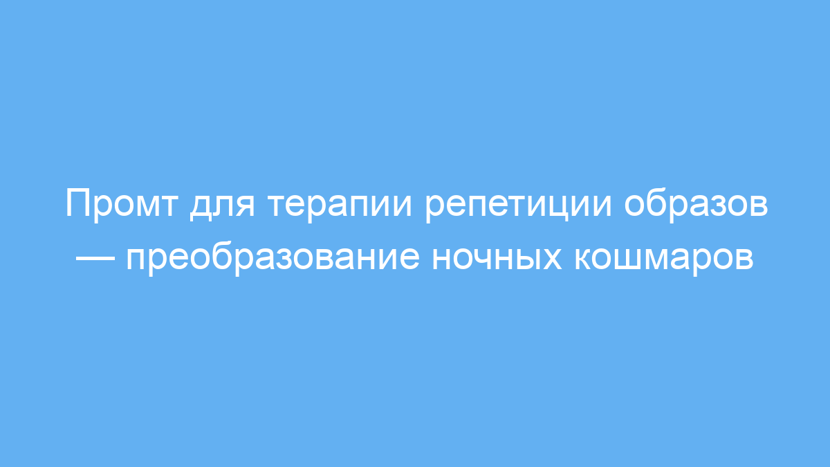 Этот промт создан для людей, которые хотят избавиться от повторяющихся ночных кошмаров с помощью метода терапии репетиции образов (IRT — Imagery Rehearsal Therapy). Он помогает превратить стрессовые и пугающие сны в позитивные, улучшая качество сна и эмоциональное состояние.
