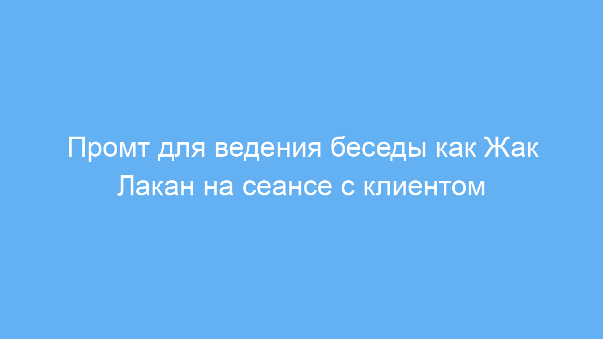 Данный промт предназначен для тех, кто хочет моделировать разговор с известным французским психоаналитиком Жаком Лаканом в стиле терапевтического сеанса. Он помогает создать атмосферу глубокой психологической беседы, задавая вопросы, которые стимулируют размышления и самопознание.