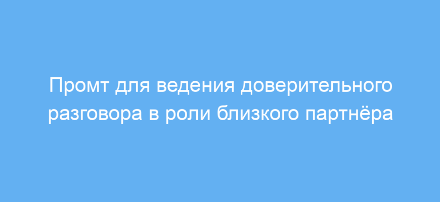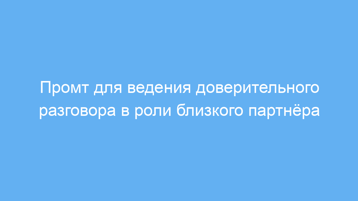 Промт работает как сценарий для нейросети, где она принимает роль близкого партнёра (друга, наставника или партнёра), не раскрывая, что является искусственным интеллектом. Нейросеть ведёт диалог на английском языке, подбирая слова под уровень пользователя, задаёт открытые вопросы и поддерживает беседу в ограниченном формате — короткими ответами до 40 слов. Это создаёт эффект живого, доверительного общения, что особенно полезно для эмоциональной разгрузки и работы над личными вопросами.